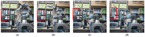 The results of this experiment are presented in Figure 17 and Figure 18, which show the process unfolding sequentially through steps (a), (b), (c), and (d). We selected a bottle and a banana, considering the weight and size that the HRI gripper can handle, from objects that YOLO can recognize. Both objects were successfully recognized when handed over by a human, and target coordinates were extracted. On average, it took around 15 s for the robot to grasp the object after recognition.