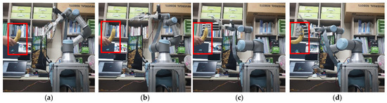 In this section, we present an experiment that applies the learning results to an actual robot to verify its functionality in a real-world environment. The process of handover in a real environment is as follows: when an object is handed over within the view of the RealSense camera, the computer connected to the camera uses YOLO and Object Tracker to identify the object and calculate the coordinates of the grasping point based on the robot’s reference frame (see Figure 16). The laptop controlling the UR3 receives the calculated position information transmitted via a ROS topic. The policy uses this updated information and the robot’s state to generate real-time actions. These actions are sent to the UR3 controller, ensuring that the HRI gripper reaches the correct position to grasp the object.