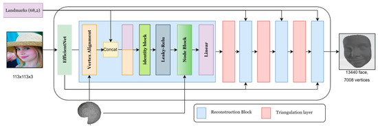 Mobile inverted bottleneck convolution (MBConvlayer) is a depthwise separable convolution where each block consists of a different number of layers with possible changes in dimensions. For MBConv1 and MBConv3 (3 × 3), we applied stride 1 and the same padding of 111 × 111 × 16 as block 2, and for MbConv6 (5 × 5), we applied stride 2, with the same padding of 57 × 57 × 24 output as block 3; for Block4, we get 29 × 29 × 80, and for the next blocks, 5, 6, and 7, we applied the same padding and stride as one but with different filters with each layer; thus, the final output features will be 29 × 29 × 320, which will be concatenated with semi-sphere landmarks as input for the first reconstruction block.