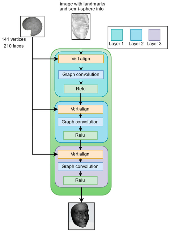 The use of deep neural networks has revolutionized the field of 3D facial reconstruction. This technique involves using a convolutional neural network (CNN) for facial image analysis, generation, and approximation of the 3DMM coefficients. This technique has significantly enhanced the accuracy and efficiency of 3D facial reconstruction processes, marking a substantial advancement in this domain [6,7,8]. Initially, a trained CNN extracts facial features from images. Subsequently, it utilizes these features to estimate 3DMM coefficients, leading to a more precise reconstruction of a 3D facial model. Notably, CNN-based methods excel in swiftly and accurately estimating 3DMM coefficients, resulting in efficient and precise 3D face reconstructions. CNN has the limitation of only working with 2D grid-structure images. The 3D mesh models have a graph structure (vertices and edges), where each image or 3D model can have a different input shape. Graph neural networks (GNNs) [9] and graph convolutional networks (GCNs) [10] are frequently employed in neural networks to manage graph structure data. These networks execute operations on these structures akin to convolutional operations performed on 2D images, offering a robust framework for graph-based computations in deep learning architectures.