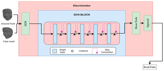 The discriminator architecture in our model, illustrated in Figure 9, is designed with a convolutional graph layer, followed by an advanced GCN block and a mean node function. The mean node function computes the average value of the features produced by the GCN block, which is crucial for effectively summarizing the feature information. Subsequently, a linear layer is applied to provide a binary classification outcome, distinguishing between authentic and synthetic (fake) meshes. The discriminator’s input is either a sample generated by the generator (fake) or a genuine sample (real) sourced from the dataset.
