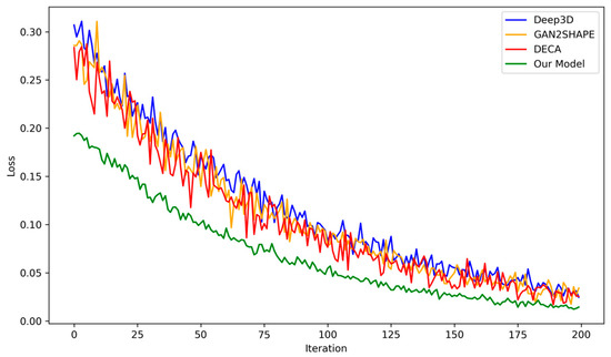 Figure 13 presents a comparative analysis of the loss values of our model against the Deep3d, the GAN2SHAPE, and DECA models. From the visualization, it is evident that the modifications implemented in our model not only result in lower loss but also enhance stability compared to the other models, which exhibit significant oscillations in loss. These oscillations can be indicative of vanishing gradients, mode collapse, or non-convergence in GANs. Achieving stability in the GAN model enables prolonged training, thereby yielding better results without the issue of mode collapse. Our model demonstrates success in stabilizing the training process. These stability improvements not only enhance the model’s performance but also make it more viable for large-scale, resource-efficient deployments in various 3D face reconstruction applications.