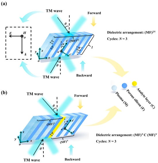The schematic diagram of the proposed MPC is shown in Figure 1. We use M to represent the plasma layer, F to represent the porous silicon layer, and N = 3 to represent the number of periods. In Figure 1a, in the ordinary structure, M and F are arranged periodically, and the arrangement rule is (MF)2N. In Figure 1b, the analyte layer (C) is introduced into the original structure, breaking the periodicity of the structure, and its arrangement rule is (MF)NC(MF)N. Two coordinate systems (x, y, z) and (x’, y’, z’) are defined in Figure 1. The coordinate system (x’, y’, z’) is obtained by rotating the coordinate system (x, y, z) clockwise by an angle of φ centered on the y-axis. Two arrows in different directions at the top and bottom indicate the forward and backward incidence of EMWs. In this paper, the initial condition set by incident EMWs is transverse magnetic (TM) wave [34], and TM mode propagation means that there is no magnetic field component in the propagation direction. The background is air, and the permittivity of layers M, F, and C is expressed by εm, εf, and εc, respectively, where εf = 1.3 and εc = 3.7 [35]. The thickness is indicated by dm, df, and dc. In Figure 1a, dm = 0.4 mm, df = 1.0 mm, and the length of the hypotenuse l = 20 mm. In Figure 1b, dm = 0.6 mm, df = 1.0 mm, dc = 1.0 mm, l = 20 mm. φ is the inclination angle of the MPC with respect to the z-axis, θ is the incidence angle of the TM wave, and the specific values are φ = 40°and θ = 50°. Related parameter settings are shown in Table 1.