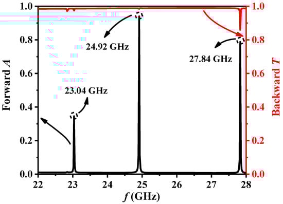 Figure 2 illustrates the EMW propagation characteristic curves corresponding to the ordinary periodic MPC in Figure 1a at frequencies ranging from 22 GHz to 28 GHz. It is evident from the figure that there is a significant difference in the propagation of the MPC when EMWs are incident in the forward and backward directions. Upon forward incidence, EMWs exhibit absorption peaks at 23.04 GHz, 24.92 GHz, and 27.84 GHz, respectively. At the three distinct resonance frequencies, the forward absorption rate can reach 0.34, 0.79, and 0.94, respectively. When the incident light is in the backward case, as Equations (18) and (19), the propagation mode will change. During this scenario, EMWs are predominantly transmitted, with a transmittance exceeding 0.9 within 22~28 GHz. Notably, at f = 24.92 GHz, the backward transmittance is 0.98, showcasing a very high forward absorption and backward transmittance, demonstrating excellent AAT characteristics.