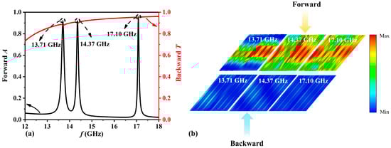 After introducing the analyte layer into the MPC, the structure diagram is depicted in Figure 1b. Figure 3 illustrates the forward absorption and backward transmission curves in this scenario, revealing the continued presence of the AAT phenomenon, which is significantly enhanced. Under forward incidence, EMWs still trigger three absorption peaks at 13.71 GHz, 14.37 GHz, and 17.10 GHz, respectively. However, unlike Figure 2, the absorption rates corresponding to the three resonant frequencies are all above 0.9, specifically 0.919, 0.917, and 0.956, respectively. The backward transmittance rates are 0.877, 0.896, and 0.953, respectively, maintaining high levels. The root cause of the asymmetric propagation illustrated in Figure 3a is explained by Equations (18) and (19). Due to the non-uniform distribution of the MPC dielectric function, the components of the dielectric constant tensor vary in different directions. This variation alters the values of kz1 and kz2, causing EMWs to experience different propagation modes when incident from opposite directions. Additionally, the MPC possesses a specific structural eigenfrequency. When the frequency of the incident EMW aligns with this intrinsic frequency, the absorption and transmission of the EMW by the MPC change significantly. For instance, at the resonance frequency, the electric field energy reaches its maximum, making the EMW more readily absorbed and resulting in a peak in the absorption curve. Figure 3b clearly illustrates the energy distribution of EMWs within the MPC, revealing that the area of the concentrated electric field energy corresponds to the trough in the absorption curve. These outcomes demonstrate that the proposed MPC exhibits multi-frequency AAT characteristics following the introduction of the defect layer, offering a fresh approach for designing asymmetric devices across various frequencies.