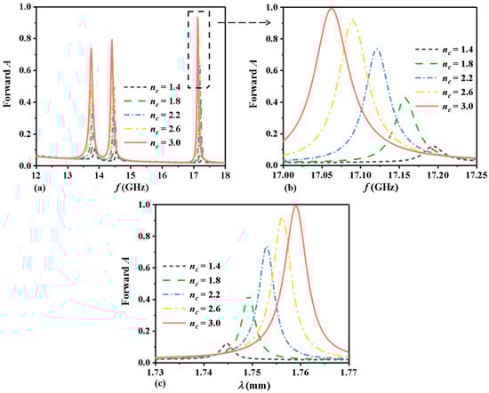 To evaluate the performance of the proposed MPC-based RI sensor, the impact of the different RI of the analyte layer on the forward absorption curves is calculated while keeping other parameters constant (as shown in Table 1). The relevant calculation results are presented in Figure 4. The RI of the analyte layer is denoted by nc, with a measurement range of 1.2 RIU to 3.8 RIU. To observe the influence of different RI on forward absorption, values of nc = 1.4 RIU, 1.8 RIU, 2.2 RIU, 2.6 RIU, and 3.0 RIU are selected for analysis. Figure 4a illustrates the variation in the forward absorption curves with changing RI within the range of 12 to 18 GHz. For clearer observation, Figure 4b displays the changes in the value corresponding to the forward absorption peak in our study of 17~17.25 GHz. It is evident that as nc increases, the peak of forward absorption will redshift, and the absorption rate will gradually increase. Specifically, when nc = 1.4, the forward absorption peaks at 17.194 GHz with an absorption rate of 0.12. As nc increases to 1.8, 2.2, and 2.6, the absorption peaks shift to 17.150 GHz, 17.114 GHz, and 17.082 GHz, respectively, with corresponding absorption rates of 0.43, 0.74, and 0.92. At nc = 3.0, the peak absorption rate reaches 0.99 at 17.054 GHz. Figure 4c illustrates the relationship between wavelength and the absorption curves. As the value of nc increases, the forward absorption peak shifts toward longer wavelengths, demonstrating a redshift phenomenon. When nc equals 3.0, the peak absorption rate reaches 0.99 at a wavelength of 1.76 mm.