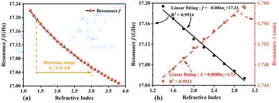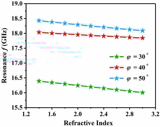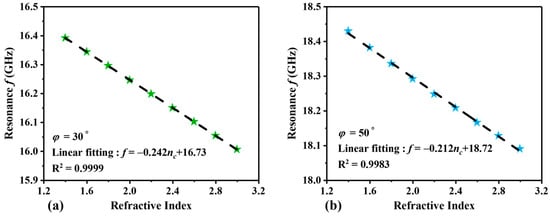 In addition, we also studied the influence of structural tilt angle φ on sensor performance. The relationship between resonance frequency and RI under different tilt angles is shown in Figure 9. In Figure 9a, when φ = 30°, the RI detection range is 1.4~3.0 RIU, and the frequency range is 16.006~16.392 GHz. The linear fitting equation is f = −0.242nc + 16.73, the S value is 242 MHz/RIU, and the linearity R2 is 0.9999. When nc = 3.0, the Q value is 76.2 and the FOM value is 1.15 RIU−1, indicating poor sensor performance. In Figure 9b, with φ = 50°, the frequency range is 18.09~18.43 GHz. The linear fitting equation is f = −0.212 nc + 18.72, S is 212 MHz/RIU, and the linearity R2 is 0.9983. When nc = 3.0, the Q value is 335 and the FOM value is 3.93 RIU−1, showing an improvement in performance compared to φ = 30°.
