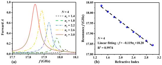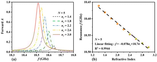 In order to evaluate the effect of the number of periods N on the performance of the sensor, we calculate the forward absorption curves for different refractive indices at N = 4 and N = 5. When N = 4, it is shown in Figure 6. Figure 6a illustrates the change in the absorption peak as nc increases. Overall, it can be observed that as nc increases, the absorption peak shifts to lower frequencies, and the absorption rate increases. When nc = 1.4 RIU, the forward absorption peaks at 18.035 GHz with an absorption rate of 0.09. With an increase in nc to 3.0 RIU, there is a peak absorption rate of 0.96 at 17.844 GHz. In Figure 6b, the resonance frequency and RI are linearly fitted. The detection range of RI remains at 1.4~3.0 RIU, and the resonance frequency shows a negative correlation with RI. The linear fitting equation is f = −0.119nc + 18.20, with an S of 119 MHz/RIU and a linearity R2 of 0.9974. When nc = 3.0 RIU, the Q value is 302.4, and the FOM value is 2.02 RIU−1. When N = 5, the absorption curves are depicted in Figure 7. In Figure 7a, when nc = 1.4 RIU, the peak of forward absorption occurs at 18.639 GHz, with an absorption rate of 0.12. With an increase in nc to 3.0 RIU, there is a peak absorption rate of 0.98 at 18.514 GHz. In Figure 7b, RI detection ranges from 1.4 RIU to 3.0 RIU, and the frequency ranges from 18.639 GHz to 18.514 GHz. The linear fitting equation is f = −0.078 nc + 18.74, with an S of 78 MHz/RIU and a linearity R2 of 0.9944. When nc = 3.0, the Q value is 363.0, and the FOM value is 1.53 RIU−1.