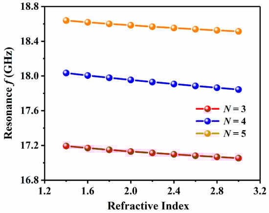 Under different period numbers N, the correlation between resonance frequency and RI is shown in Figure 8, where N = 3, 4, and 5 are represented by red, blue, and orange, respectively. It is evident that as N increases, the resonance frequency also increases. Based on the analysis, altering the period number N will impact the resonance frequency and RI values. Therefore, selecting the appropriate N is essential for enhancing sensor performance.