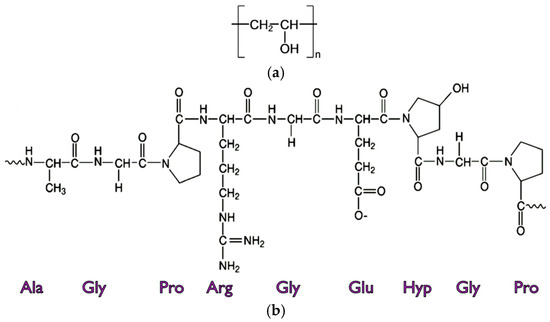 Gelatin is a natural polymer based on protein sourced from collagen, which is mainly obtained from the skins, connective tissues (tendons and ligaments), and bones of cows and pigs [46]. In general, gelatin can be divided into two types by using raw materials and the pre-treatment applied during the manufacturing process: type A with an acid treatment, and type B with an alkaline treatment. Recently, gelatin’s humidity-sensing ability has been studied because of its hygroscopic characteristics with biocompatibility and biodegradability. The changes in the resistance of a gold interdigitated electrode (IDE) structure coated with gelatin polymer were measured when the RH varied from 15% to 86% [47]. The performance of gelatin as a capacitive humidity-sensing material was examined with the changes in the capacitance of a planar IDE coated with gelatin when the RH was ramped up and down between 50% and 90% with a step of 10% [48]. However, these characteristic studies were conducted in the low-frequency band, and a comparison of the humidity sensitivity for gelatin with other polymers using a capacitive microwave sensor has never previously been studied in microwave frequency bands (0.3 to 300 GHz). The chemical structures of PVA [49] and gelatin [50] are shown in Figure 1. PVA is a water-soluble synthetic polymer consisting of a carbon chain as its backbone, and a hydroxyl (OH) functional group, and has various desirable properties, such as a high hydrophilicity, biocompatibility, and good film-forming and process abilities [51]. Gelatin is a natural polymer with a heterogeneous mixture of single- or multi-stranded polypeptides containing between 300 and 4000 amino acids [52]. The amino acid compositions of gelatin are 26~30% of glycine (Gly), 14~18% of proline (Pro), 13~15% of hydroxyproline (Hyp), 11~12% of glutamic acid (Glu), 8~10% of alanine (Ala), 8~9% of arginine (Arg), and other amino acids [53]. The hydroxyl functional group in hydroxyproline might play an important role in the humidity-sensing capability along with the porous structure of gelatin.