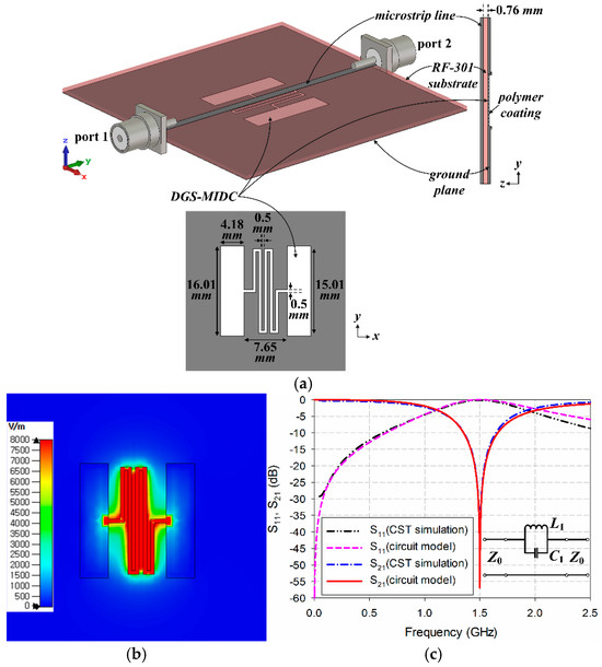 DGS-MIDC-based microwave sensor: (a) geometry, (b) electric-field distribution at 1.5 GHz, and (c) S-parameter characteristics and simplified equivalent circuit model.