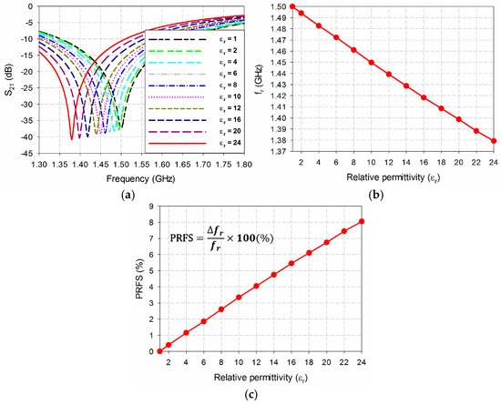 The changes in the first resonant frequency (fr) and the percent relative frequency shift (PRFS) of the S21 characteristics for the microwave sensor with the DGS-MIDC are shown in Figure 3. The PRFS is a percentage of the difference between the loaded and unloaded first resonant frequencies compared to the unloaded first resonant frequency. The coated polymer’s relative permittivity (εr) changed from 1 to 24 for the lossless case (tan δ = 0) [44]. As the relative permittivity increased, the first resonant frequency decreased. For example, the first resonant frequency moved to 1.3793 GHz and its PRFS compared to the unloaded one at 1.5 GHz was 8.05% when the relative permittivity increased from 1 to 24.