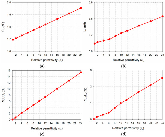 Figure 4 shows the extracted equivalent capacitance and inductance, and their percent relative shifts when the relative permittivity of the MUT polymers varies from 1 to 24 with tan δ = 0. In this case, both the equivalent capacitance and inductance changed linearly. For instance, when the relative permittivity of the MUT was εr = 1, C1 and L1 of the proposed microwave sensor were 1.6938 pF and 6.6464 nH, respectively. As the relative permittivity of the MUT increased to εr = 24, C1 and L1 were increased to 1.9541 pF and 6.8141 nH, respectively. Therefore, ΔC1/C1(%) and ΔL1/L1(%) were 15.4% and 2.5%, respectively. Both C1 and L1 show nearly linear behaviors, but the variation in C1 is much higher compared to L1.