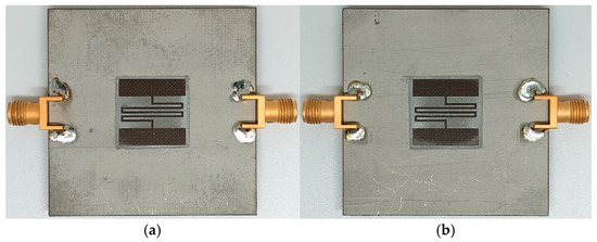 A high-sensitivity two-port microwave sensor based on a DGS-MIDC was designed on a 50 mm × 50 mm RF-301 substrate with a relative permittivity (εr) of 2.97, a loss tangent (tan δ) of 0.0009, and a thickness of 0.76 mm to concentrate the electric field along the microstrip transmission line, as shown in Figure 2a. The DGS-MIDC was etched on the ground plane of the microstrip transmission line with a width of 1.68 mm, and the geometric parameters were optimized to obtain the first resonant frequency of S21 at 1.5 GHz for unloaded conditions with a high sensitivity for relative permittivity. The proposed microwave sensor with the DGS-MIDC showed a band-stop characteristic at the resonant frequencies. When a capacitive polymer is coated on the top of the DGS-MIDC, the resonant frequencies of the microwave sensor change according to the variations in complex permittivity of the coated capacitive polymer for different RHs.