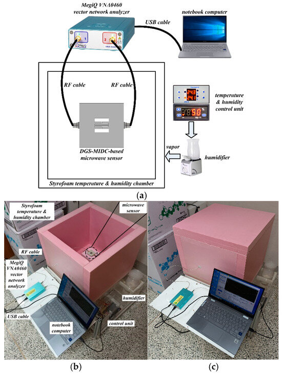 For the humidity-sensing measurements, the experimental setup shown in Figure 6 was used. A custom-made low-reflective temperature and humidity chamber was manufactured using 50 mm thick Styrofoam walls, a thermostat for controlling temperature, a humidistat for controlling humidity, halogen lamps for adding temperature, and a humidifier for adding humidity. The MegiQ VNA-0460 (MegiQ, Eindhoven, The Netherlands) vector network analyzer was used to measure the S21 characteristics of the polymer-coated fabricated microwave sensors. The RH was increased from 50% to 80% with a step of 10% with a fixed temperature of around 25 °C. For the stabilization of the humidity inside the chamber along with ensuring water absorption into the polymer-coated area, the S21 characteristics were measured after waiting 10 min for each RH.