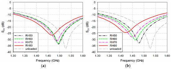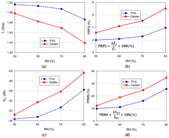 The measured S21 characteristics of the fabricated microwave humidity sensors coated with PVA and gelatin, respectively, for each RH were compared in Figure 7. The measured first resonant frequency and magnitude level of the fabricated microwave sensors without a polymer coating (unloaded conditions) were 1.526 GHz and −37.38 dB, respectively. When the RH increased from 50% to 80% for the PVA-coated microwave sensor, the S21’s first resonant frequency moved from 1.496 GHz to 1.446 GHz, while its magnitude level increased from −33.69 dB to −27.79 dB. As the RH increased from 50% to 80% for the gelatin-coated microwave sensor, the S21’s first resonant frequency shifted from 1.478 GHz to 1.419 GHz, while its magnitude level increased from −32.82 dB to −24.41 dB. The values of the measured first resonant frequencies, PRFSs, magnitude levels, and percent relative magnitude shifts (PRMSs) of the fabricated microwave humidity sensors coated with PVA and gelatin are summarized in Table 2 and Table 3. Note that the PRMS is a percentage of the difference between the magnitude levels at the loaded and unloaded first resonant frequencies compared to the magnitude level at the unloaded first resonant frequency [44].