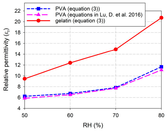 Comparison of the extracted relative permittivity from measured PRFSs of PVA- and gelatin-coated microwave sensors for varying RH.
