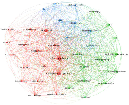 Figure 1. The figure exhibits three distinct color clusters, namely, red, blue, and green. The analysis reveals that heat island and Urban Heat Island are the terms that occur the most frequently, highlighting the central focus of UHI studies. Keywords such as atmospheric temperature, landforms, and surface temperature reflect the emphasis on understanding the physical and environmental factors influencing UHI. The presence of remote sensing, Landsat, and spatiotemporal analysis demonstrates the extensive use of advanced technologies in these studies. Furthermore, regression analysis is prominent, highlighting its role in quantitatively assessing the relationships between UHI and various influencing factors. The focus on urbanization, urban planning, and climate change indicates a growing interest in the relationship between UHI and broader urban and environmental challenges.