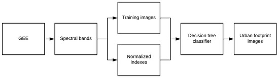 From the recovered data, 8 urban footprint maps (one for each year from 2014 to 2021) were created after pixel-by-pixel classification. This process was performed following the decision tree classifier shown in