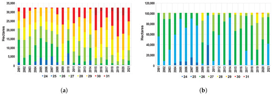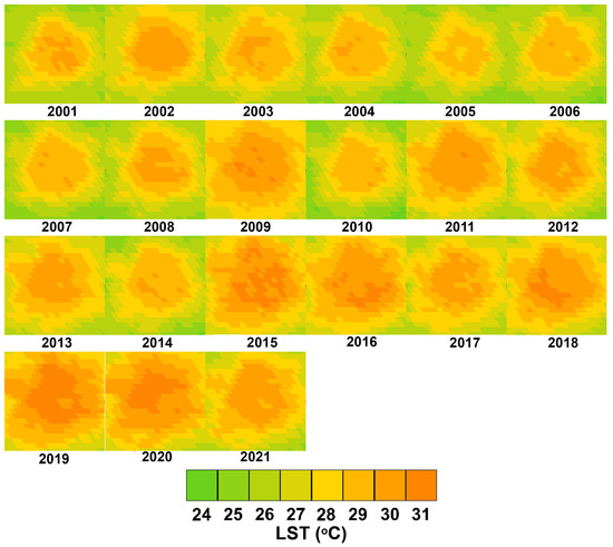 In particular, LST readings between 29 °C and 31 °C became steadily more frequent throughout the studied period, accounting for approximately 38.7% of the total surface area of the MAM in 2021, compared to 17.5% in 2001.