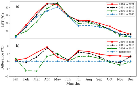 4)) for each available year (from 2014 to 2021). Afterwards, these values were contrasted with the average pixel-by-pixel LST annual means from 2014–2021 (variable