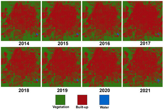 29]. Both studies suggest that urbanization is a significant driver of LST increases. Our study observed a rise in urban coverage from 51.32% in 2014 to 59.68% in 2021, while Waleed and Al-Bakri [