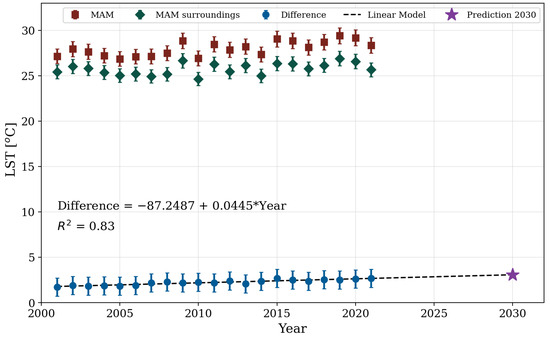 In addition, the average of the pixel-by-pixel LST annual means of each studied year (from 2001 to 2021) was calculated for the MAM as well as for its surroundings (see