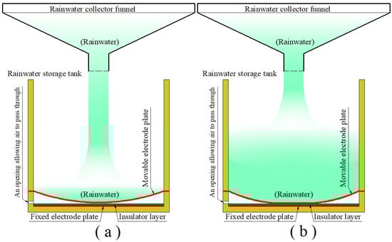 The term “rainfall” refers to the total amount of rain that falls in a particular area in a particular amount of time, usually measured in millimeters. Usually, a funnel that is wide at the top and narrow at the bottom is placed outside to be used to collect the water that falls from the sky to the ground when it rains. The total volume of the rainwater that is collected over a given period of time divided by the top opening area of the rainwater collector funnel is the rainfall, as shown in Figure 1, where the rainwater collected is poured into a cylindrical storage tank through the bottom opening of the funnel to measure its total volume. The bottom of the cylindrical rainwater storage tank is made of a circular conductive membrane, and, before the tank holds rainwater, the circular conductive membrane is initially flat, and, after the tank holds rainwater, it will elastically deflect axisymmetrically. Therefore, if the initially flat circular conductive membrane coaxially faces a circular conductive rigid thin plate coated by a thin layer of insulator, where the membrane and plate have the same radius and keep a parallel gap, then the circular conductive membrane and rigid thin plate can be used as a moveable electrode plate and a fixed electrode plate to form a non-parallel-plate variable capacitor, as shown in Figure 1.