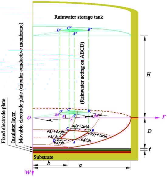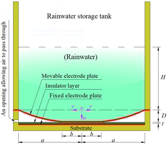 The elastic behavior of the moveable electrode plate (circular conductive membrane) in contact with the insulator layer on the fixed electrode plate under the action of the rainwater in the rainwater storage tank can be mechanically simplified as a plate/membrane contact problem wherein an initially flat, peripherally fixed circular membrane comes into frictionless axisymmetric contact with a rigid thin plate under the action of non-uniformly distributed transverse loads. It can be seen from Figure 2 that the rainwater in the rainwater storage tank, as transverse loads acting on the circular membrane, is distributed axisymmetrically, although non-uniformly, on the deflected circular membrane. Therefore, the distribution of the rainwater in the rainwater storage tank is only related to the radial coordinate r, and has nothing to do with the circumferential coordinate φ.