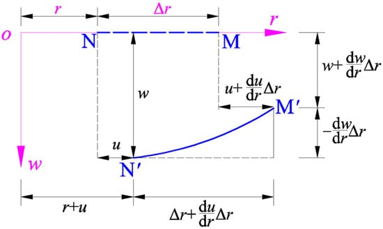 The geometric relationship between the radial strain and the radial and transverse displacements, i.e., the so-called radial geometric equation, can be formulated as follows: A micro straight line element with length ∆r is assumed to be taken along the radial direction on the polar plane (r, φ), and, after deformation, it becomes a micro curve element along the meridian direction of the deflected circular membrane, making the material particle N produce the radial displacement u and transverse displacement w, as shown in Figure 4.