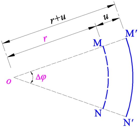In addition, the geometric relationship between the circumferential strain and the radial displacement, i.e., the so-called circumferential geometric equation, can be formulated as follows: A micro curve element with radius r and central angle ∆φ is assumed to be taken along the circumferential direction on the polar plane (r, φ), and, after deformation, it becomes a micro curve element along the circumferential direction of the deflected circular membrane, making the material particles N and M simultaneously produce the radial displacement u, as shown in Figure 5.