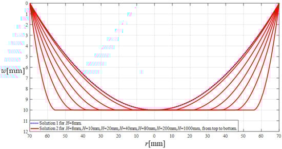 The deflection expression w(r) of the dashed line (“Solution 1”) in Figure 6 is determined as follows: The power series coefficients ci and di (i = 1, 2, 3, …) are expressed as polynomials with regard to the undetermined constants c0 and d0 and the dimensionless variables H0 = H/a and G = ρga2/E/h, as shown in Equation (37) and Appendices A and B in []. When H = 8 mm, a = 70 mm, h = 0.3 mm, E = 3.05 MPa, v = 0.45, ρ = 10−6 kg/mm3, and g = 9.8 N/kg, the values of the dimensionless variables H0 and G are about H0 = 0.1142857143 and G = 0.0524808743, respectively, and the values of the undetermined constants c0 and d0 can be determined by simultaneously solving Equations (26) and (27) in [] and are about c0 = 0.0234613886 and d0 = 0.1428600005. Therefore, from Equations (17) and (25) in [], the deflection expression w(r) of the dashed line (“Solution 1”) in Figure 6 can be finally written as