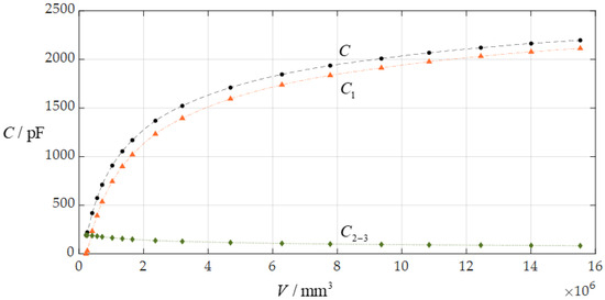 Now, let us analyze the input–output relationship of the rainwater volume V as the input and total capacitance C as the output, i.e., the V-C relationship, to understand the characteristics of the hardware system of this circular touch mode capacitive rainfall sensor. To this end, we plot the numerical values of the capacitance C1, C2-3 (C2-3 = C2C3/(C2 + C3)), and C, and rainwater volume V in Table 1 as a scatter plot, to investigate the respective contributions of the capacitance C1 in the plate/membrane contact region (0 ≤ r ≤ b) and capacitance C2-3 in the plate/membrane non-contact region (b ≤ r ≤ a) to the total capacitance C, as shown in Figure 7. It can be seen from Figure 7 that the capacitance C1 of the plate/membrane contact region (0 ≤ r ≤ b) has achieved a dominant position in the total capacitance C, while the share of the capacitance C2-3 of the plate/membrane non-contact region (b ≤ r ≤ a) in the total capacitance C is very small. This is what makes this circular touch mode capacitive rainfall sensor special.