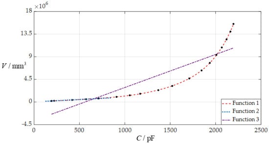 However, neither the V–C analytical relationship nor the C–V analytical relationship can be derived directly from Equations (64) and (65), because it is impossible to eliminate the parameter H directly from Equations (64) and (65) (which is included in the dimensionless variable H0 in the expressions for the power series coefficients di—see Equation (37) and Appendix A). The input–output analytical relationship between the total capacitance C and the total rainwater volume V of the circular touch mode capacitive rainfall sensor addressed here, the V–C or C–V analytical relationship, can be given in the form of an explicit expression only by the least-squares data fitting based on a large number of numerical calculations for the total capacitance C and its corresponding total rainwater volume V, which will be shown in the following section.