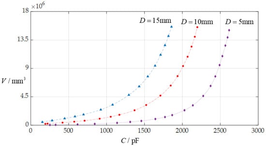 After that, the numerical calibration of the input–output analytical relationship of the circular touch mode capacitive rainfall sensor can be started. Obviously, since the input–output relationship of the whole rainfall measurement system needs to be described, the total capacitance C should be the input variable while the total rainwater volume V should be the output variable; the input–output analytical relationship can be abbreviated as the C–V analytical relationship. As stated in Section 2.2, the C–V analytical relationship can be given in the form of an explicit expression only by the least-squares data fitting based on a large number of numerical calculations for the total capacitance C and its corresponding total rainwater volume V. Therefore, the slightly increased value of H in the above numerical calculations should be an increment as small as possible to produce as many numerical calculation values as possible, thus ensuring the fitting accuracy of the fitted C–V analytical relationship.