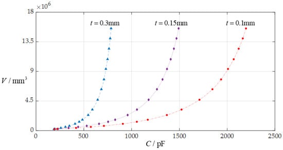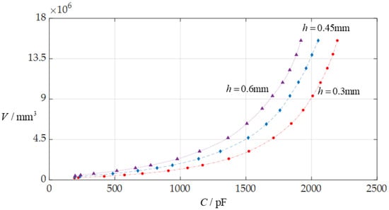 The effect of changing the membrane thickness h on the C–V relationship when a = 70 mm, D = 10 mm, t = 0.1 mm, E = 3.05 MPa, ν = 0.45, and h takes 0.3 mm, 0.45 mm, and 0.6 mm, respectively.