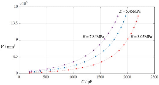 The effect of changing the Young’s modulus of elasticity E on the C–V relationship when a = 70 mm, D = 10 mm, h = 0.3 mm, t = 0.1 mm, ν = 0.45, and E takes 7.84 MPa, 5.45 MPa, and 3.05 MPa, respectively.