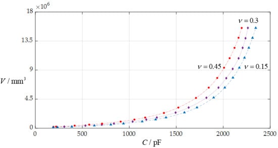 The effect of changing the Poisson’s ratio v on the C–V relationship when a = 70 mm, D = 10 mm, h = 0.3 mm, t = 0.1 mm, E = 3.05 MPa, and v takes 0.45, 0.3, and 0.15, respectively.