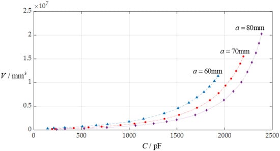 The effect of changing the circular membrane radius a on the C–V relationship when D = 10 mm, h = 0.3 mm, t = 0.1 mm, E = 3.05 MPa, ν = 0.45, and a takes 80 mm, 70 mm, and 60 mm, respectively.