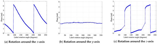 The measurement results are shown in Figure 4, the phase change of the tag rotating around the x-axis shows a linear characteristic, with the slope of the change exhibiting 2. When the tag rotated around the y-axis, there was no significant change in the phase. However, when the tag rotated around the z-axis, there were some blind spots between the reader and tag, due to a mismatch in polarization directions. Therefore, during the actual localization process, consideration should be given to placing the tag array on top or on the side of the object, to ensure more reliable reads.