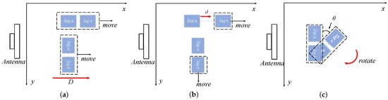Phase offsets for different situations: (a) tag array moves parallel to the x-axis; (b) tag array moves perpendicular to the x-axis; (c) tag array rotation.