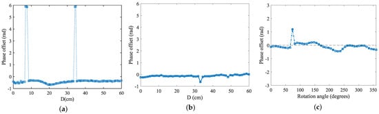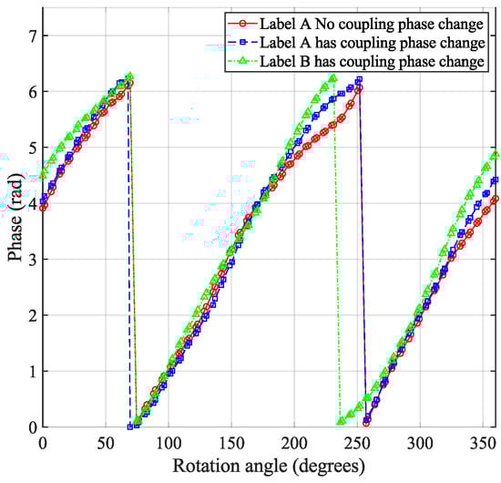 Based on the experimental results from Section 3.3.1, which showed a linear pattern in phase when the tag was rotated around the x-axis, and considering the importance of this linear pattern in phase information, this experiment focused on coupling tests of the tag array under x-axis rotation conditions. Having already verified the phase change characteristics of a single tag relative to the antenna polarization direction, when extending this test to the tag array, it was observed that the phase changes between the two adjacent tags still followed the pattern described in Section 3.3.1. In Figure 9, the phase change pattern of the tag array during rotation is displayed. Specifically, the phase shift was first tested with tag rotating around the x-axis, followed by adding tag and performing the same test. The phase offset is illustrated in Figure 8c. The experimental results suggested that the rotation angle of the array did not significantly affect the phase, indicating that, in practical applications, the coupling effect of the tag array relative to the antenna angle does not require excessive attention.