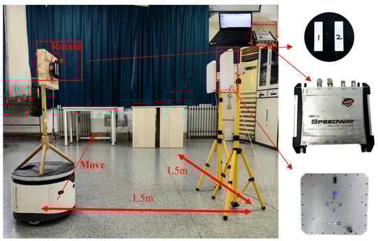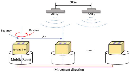 During the experimental validation process, we designed two antennas and placed them in parallel with a 50 cm spacing. This spacing was chosen to ensure there was enough distance between the antennas to reduce mutual interference, while maintaining continuous and effective coverage of the moving tags. This setup allowed us to capture signals from two different angles simultaneously when the tag underwent dynamic displacement and rotation, thus enhancing the accuracy and robustness of the pose recognition. Additionally, based on the analysis of typical application scenarios (such as warehouses and logistics centers) where tags might be attached, we found that goods and pallets are often stacked to a certain height. Positioning the tag at a height of approximately 100 cm from the ground placed it in the upper-middle range of this stacking height, representing most practical application scenarios. This further ensured the effectiveness of the tag recognition. The tag was experimentally mounted on a mobile robot equipped with a rotating turntable. The robot moved in a straight line within an indoor area, causing the tag to experience changes in both displacement and rotation angles at any given moment. Through this process, we successfully validated the system’s recognition accuracy under conditions of dynamic tag displacement and rotation. The specific scenario is illustrated in Figure 14.