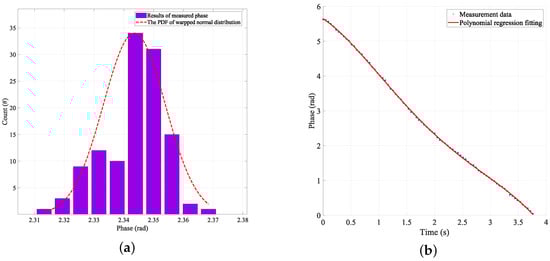 The phase information collected during the movement of the tag was accompanied by some inherent problems such as ambiguity, phase error due to the hardware characteristics, and phase random noise. According to the hyperbolic localization method used in a previous paper, the process eliminates the phase ambiguity problem and the phase error problem caused by hardware errors. For the random error generated by phase noise, according to previous studies [18,31,32] and experimental verification, the noise of the phase signal obeys a Gaussian distribution during the tag acquisition process, and Figure 13a shows the distribution of 107 phase measurements measured by the reader at 920.675 MHz frequency when the tag was fixed at a distance of 100 cm. According to the distribution of the phase, using polynomial regression compensates for the measured phase.