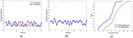 Positioning error for label moving unrotated scenario: where (a) shows the positioning error accuracy of the tag in the x-axis direction and the y-axis direction, (b) represents the overall error accuracy in the x and y directions, and (c) denotes the cumulative distribution function of the error with or without considering the coupling in the model.
