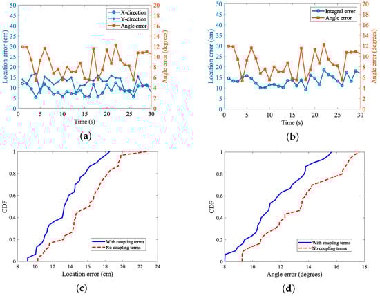 Positioning error in the label moving with rotation scenario: (a) x- and y-axis direction errors; (b) overall labeling error; (c) positioning with and without the coupling term CDF; (d) angle with or without coupling term CDF.