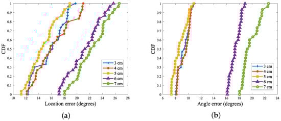 In an in-depth study of the effect of label spacing on the perception results, the experiments systematically set the spacing of the label arrays, starting from 3 cm and spaced at 1 cm intervals up to 7 cm, for exhaustive experimental testing. In Figure 17, the figure visualizes the effect of tag spacing on the positioning error and angular error.