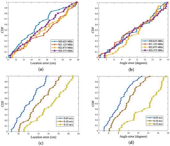 (a,b) Effect of reader operating frequency on positioning and angle recognition accuracy; (c,d) Effect of tag movement speed on positioning and angle recognition accuracy.