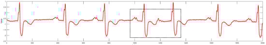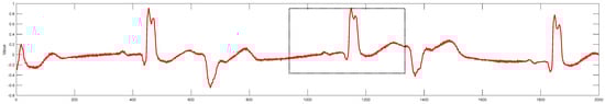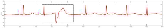 The left bundle branch block (LBBB) refers to a blockage or delay in the conduction of the left bundle branch. Under normal conditions, electrical impulses originate from the sinoatrial node, pass sequentially through the atrioventricular node, the His bundle, the left and right bundle branches, and finally reach the ventricles, causing ventricular depolarization and contraction. However, in the case of LBBB, the electrical signal cannot pass through the left bundle branch and instead first travels through the right bundle branch to the right ventricle, then spreads to the left ventricle via myocardial fibers, altering the sequence of ventricular depolarization. This abnormal conduction pathway leads to characteristic changes in the electrocardiogram [22]. The main features include the following: a QRS complex typically exceeding 120 milliseconds due to the delayed depolarization of the left ventricle, resulting in a widened QRS complex; in lead V1, the QRS complex usually appears as a deep and broad S wave, with the absence of a normal R-wave, forming a “W” -shaped pattern. Additionally, due to abnormal depolarization, secondary changes in the ST segment and T wave occur, with their direction opposite to the main QRS wave [23]. The ECG of the left bundle branch block in the MIT-BIH dataset is shown in Figure 3.