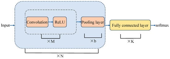 CNN is one of the most effective deep learning models for solving various application problems [26]. A CNN model typically consists of four different types of layers: convolutional layers, activation layers, pooling layers, and fully connected layers. The overall structure of a commonly used CNN is shown in Figure 5.